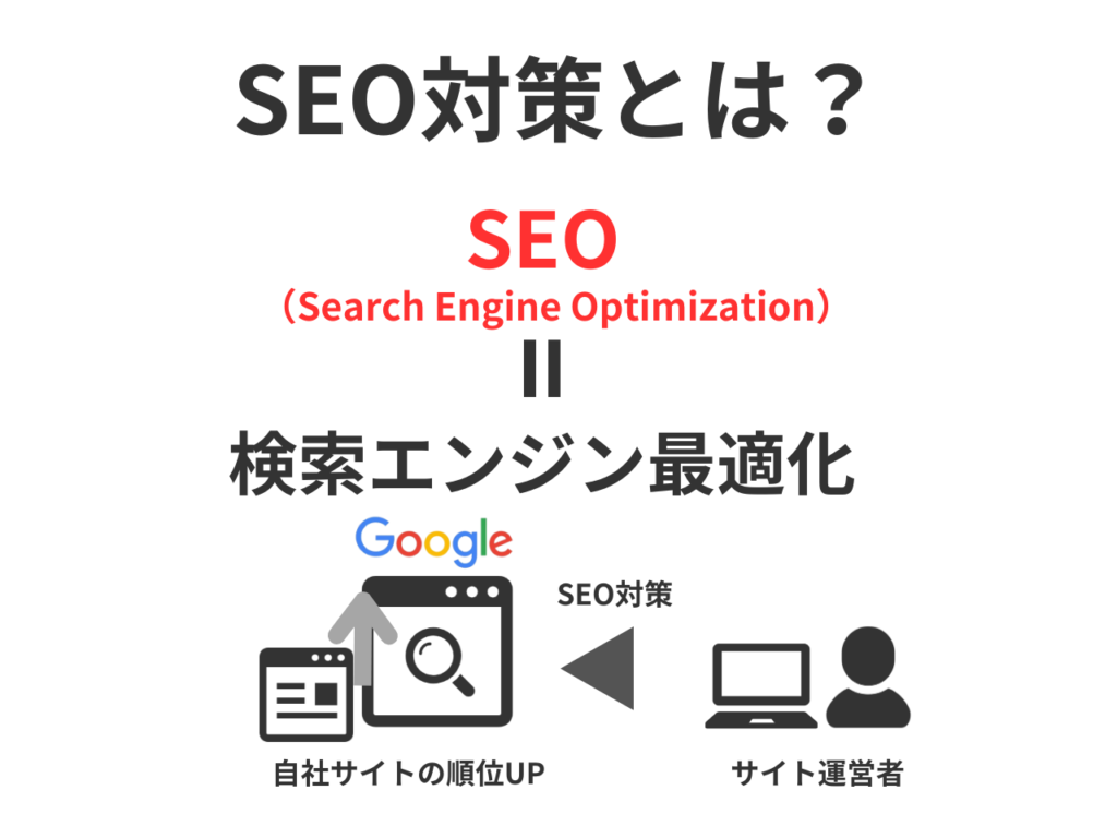 SEO対策とは「検索エンジン最適化」を意味し、Googleなどの検索結果で自社サイトを上位に表示させる一連の技術です。