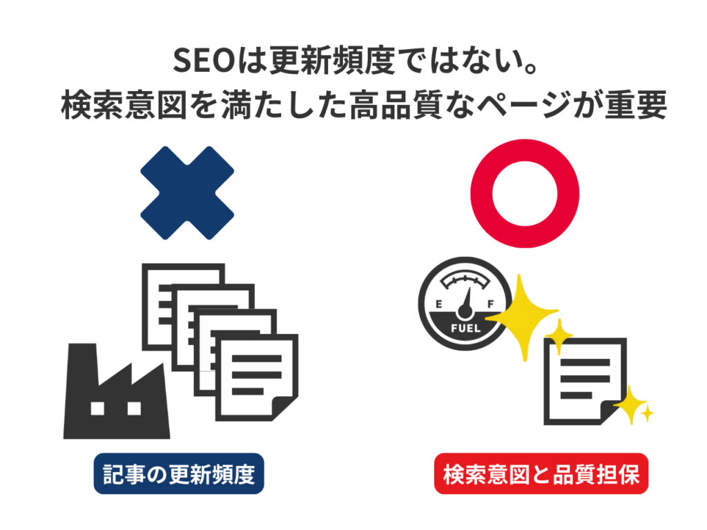SEO対策において最も優先すべき事項は、ユーザーの検索意図を満たす高品質なコンテンツの提供です。 更新頻度を高めることだけを目的にして、内容の薄い記事を量産してもSEOの成果には繋がりません。