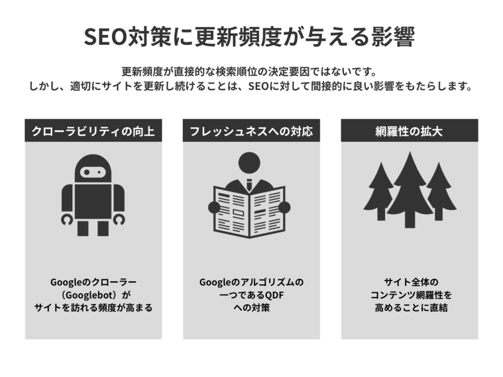 Googleは「更新頻度そのものは検索順位の直接的な決定要因ではない」と明言していますが、サイト全体の情報の鮮度や網羅性を高めることは、間接的に評価を向上させる要因となります。