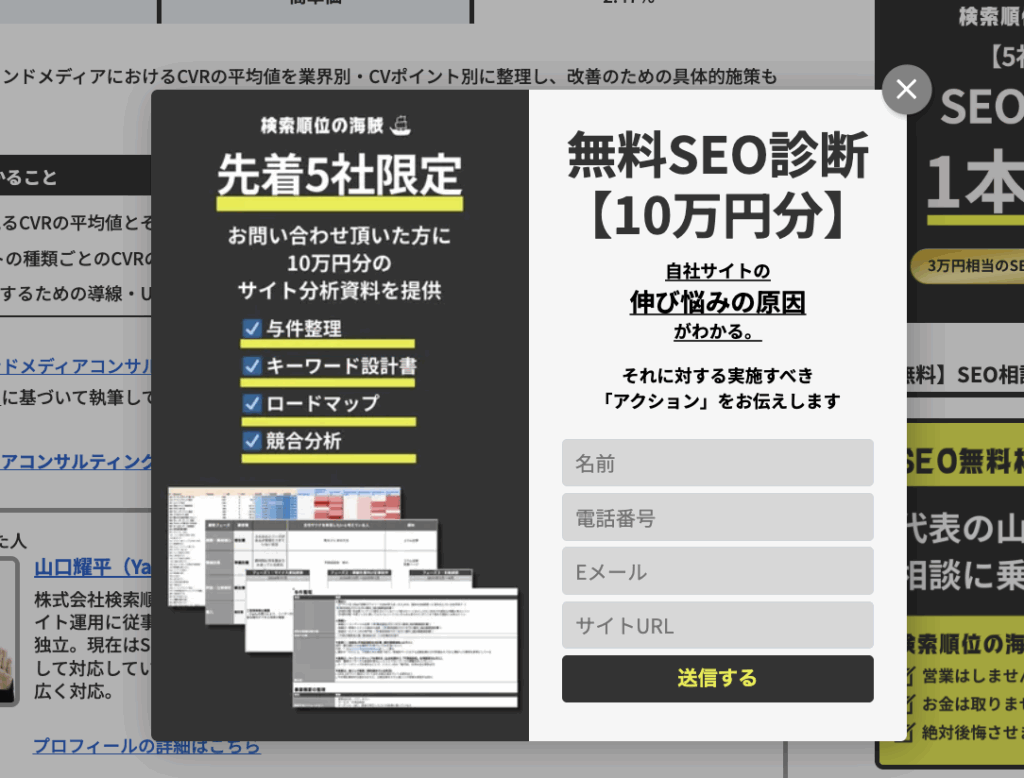 ユーザーのスクロールにあわせて画面中央に浮かび上がる「フローティング型」や「ポップアップ型」は、強制的に注意を引くCTAとして非常に高い視認性を持ちます。