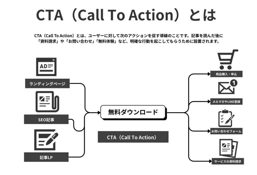 CTA(Call To Action)とは、ユーザーに対して次のアクションを促す導線のことです。記事を読んだ後に「資料請求」や「お問い合わせ」「無料体験」など、明確な行動を起こしてもらうために設置されます。
