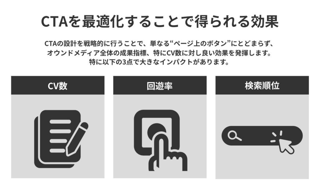 CTAの設計を戦略的に行うことで、単なる“ページ上のボタン”にとどまらず、オウンドメディア全体の成果指標、特にCV数に対し良い効果を発揮します。特に以下の3点で大きなインパクトがあります。