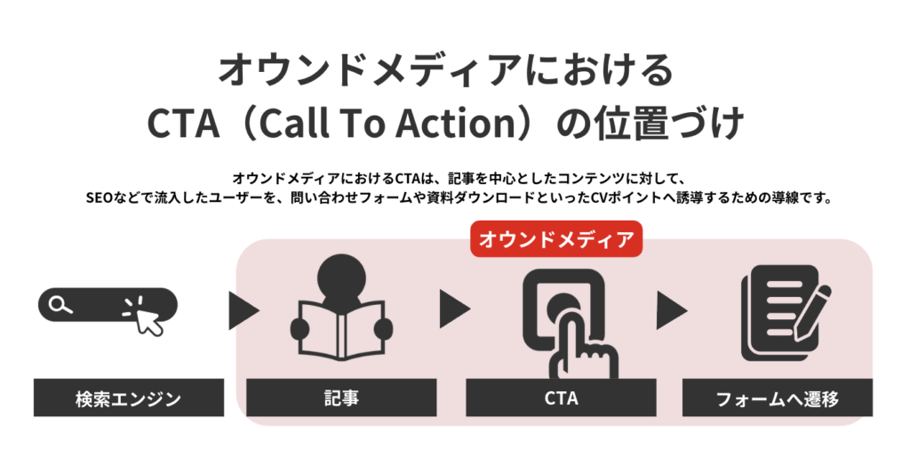 オウンドメディアにおけるCTAは、記事を中心としたコンテンツに対して、SEOなどで流入したユーザーを、問い合わせフォームや資料ダウンロードといったCVポイントへ誘導するための導線です。