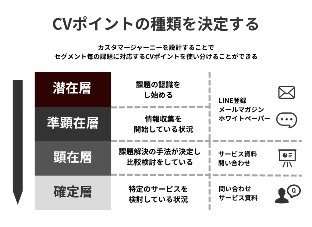 カスタマージャーニーをもとに、ユーザーの各段階に応じたCVポイント(コンバージョン行動)を定義します。CVは1種類ではなく、段階に応じて複数設計すべきです。