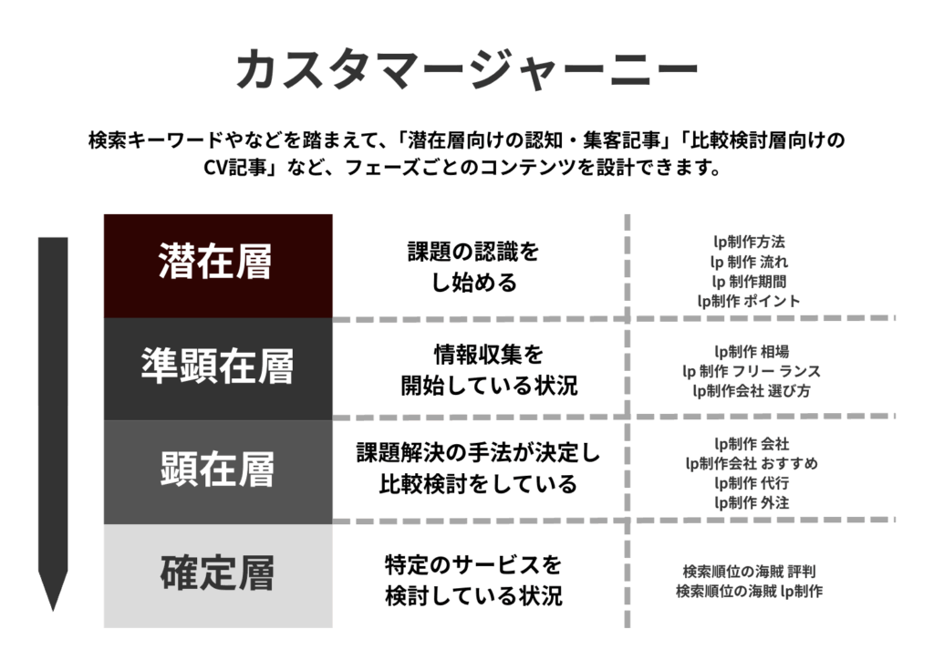しかし、オウンドメディアには、LPと異なり「今すぐ問い合わせたい顕在層」だけでなく、準顕在層・潜在層など、温度感の異なる幅広いユーザーが流入します。