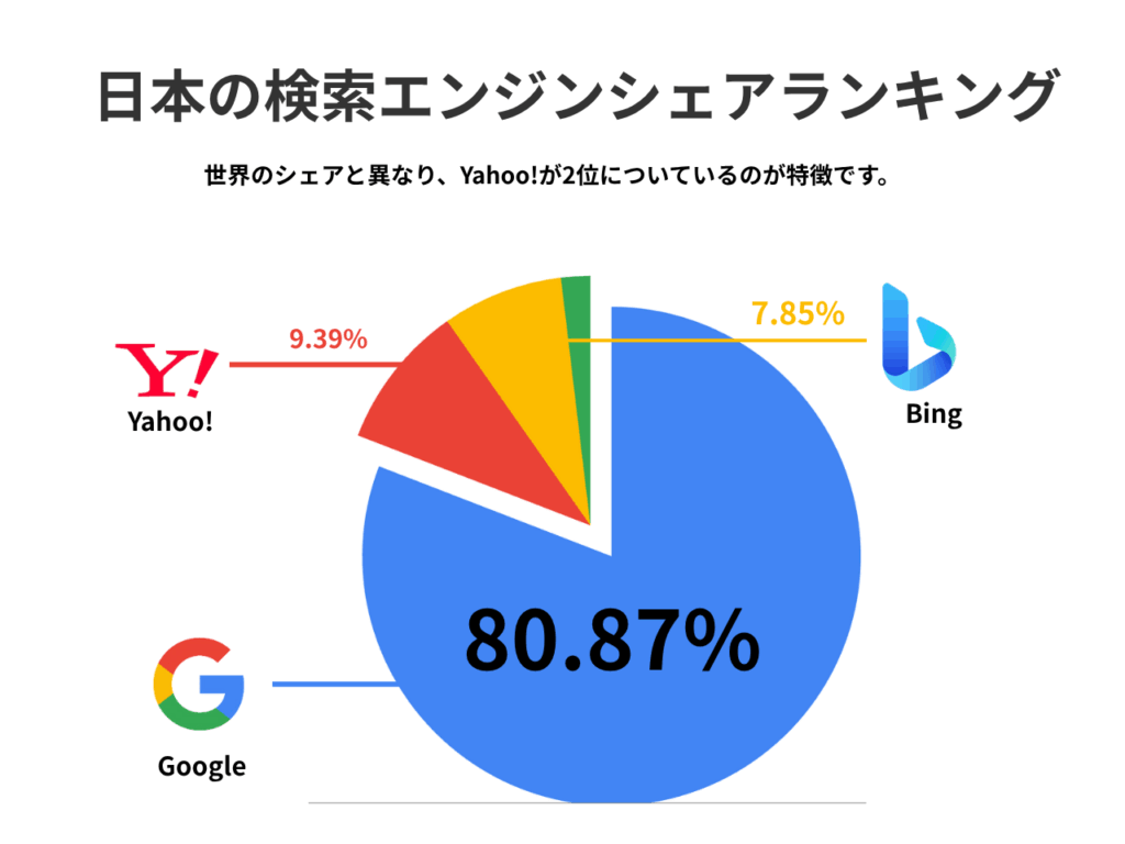 2025年時点での、最新の調査データでも、Googleのシェアは70〜80%前後に達しています。Yahoo!の検索結果もGoogleのアルゴリズムを利用しているため、実質的に9割以上がGoogleの影響下にあります。つまり、SEO対策を考える際にはGoogleに最適化することが最優先課題になります。