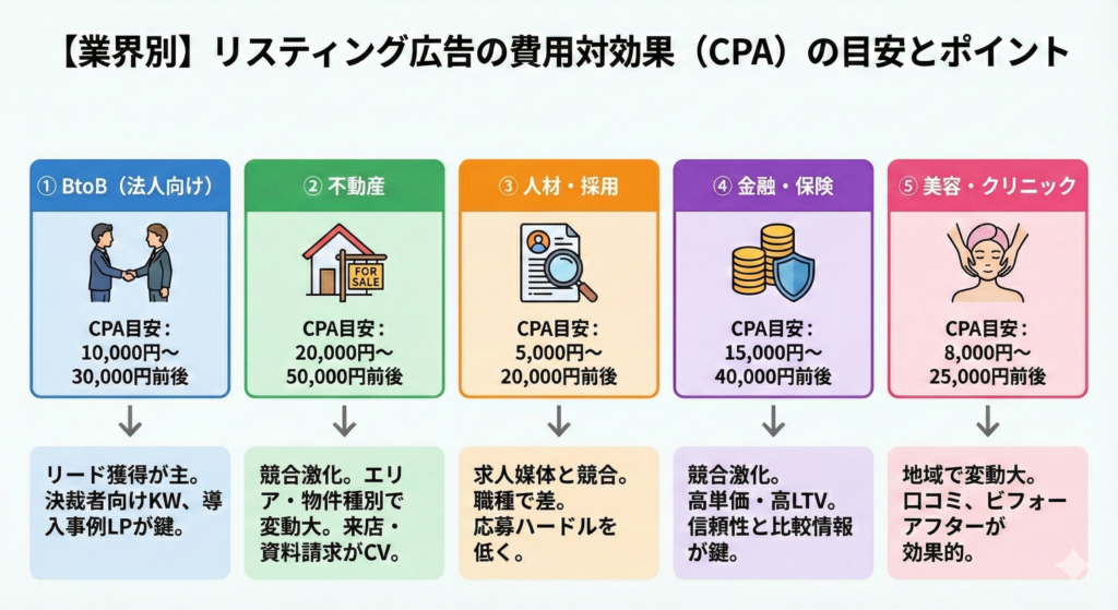 - 主要5業界におけるCPA(顧客獲得単価)の目安