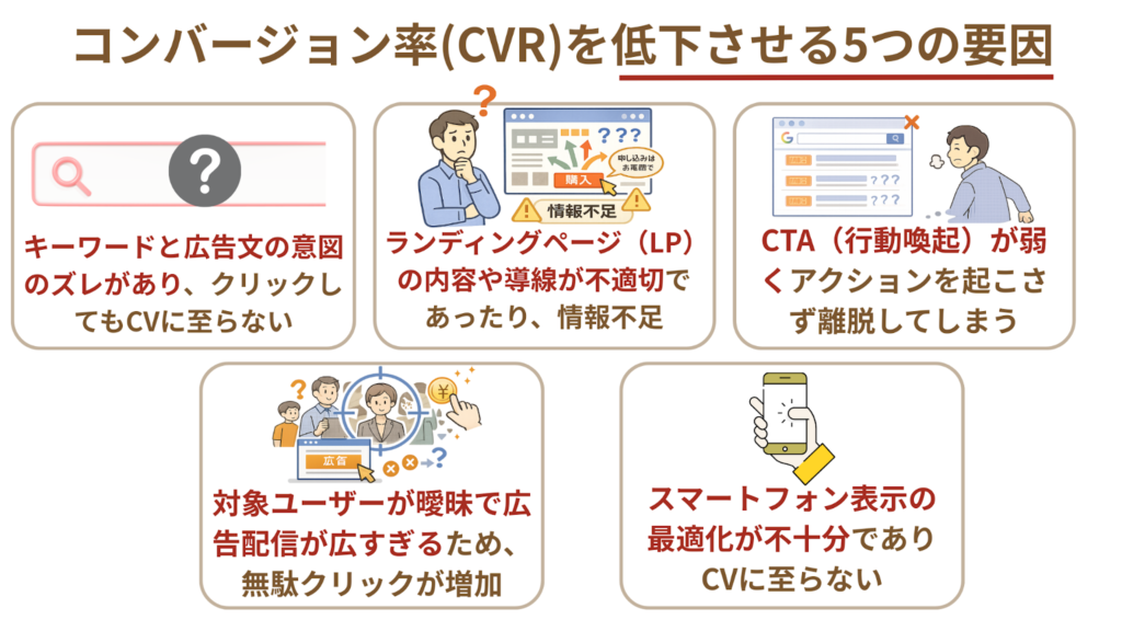 H2:リスティング広告のコンバージョン率(CVR)を低下させる5つの要因