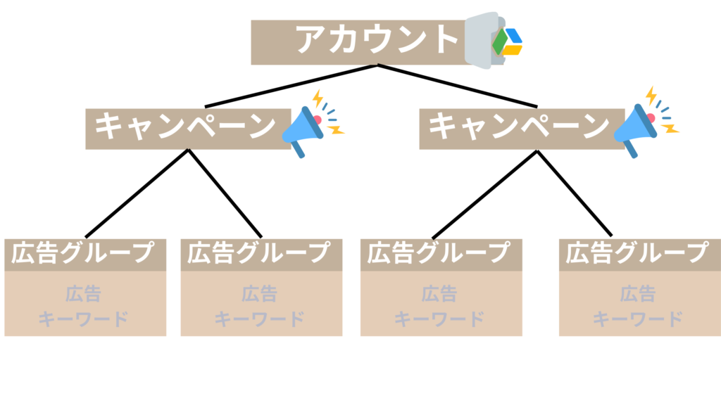 アカウントは「キャンペーン」「広告グループ」「広告」「キーワード」という階層構造で成り立っており、それぞれに明確な役割があります。