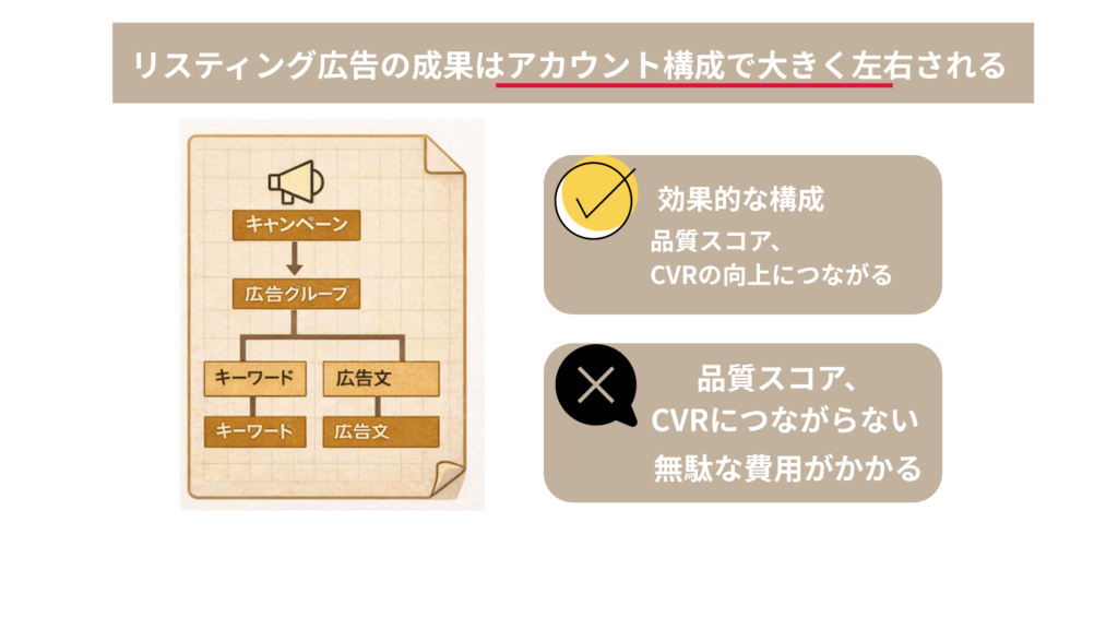 リスティング広告の成果は、アカウント構成の設計で大きく左右されます。