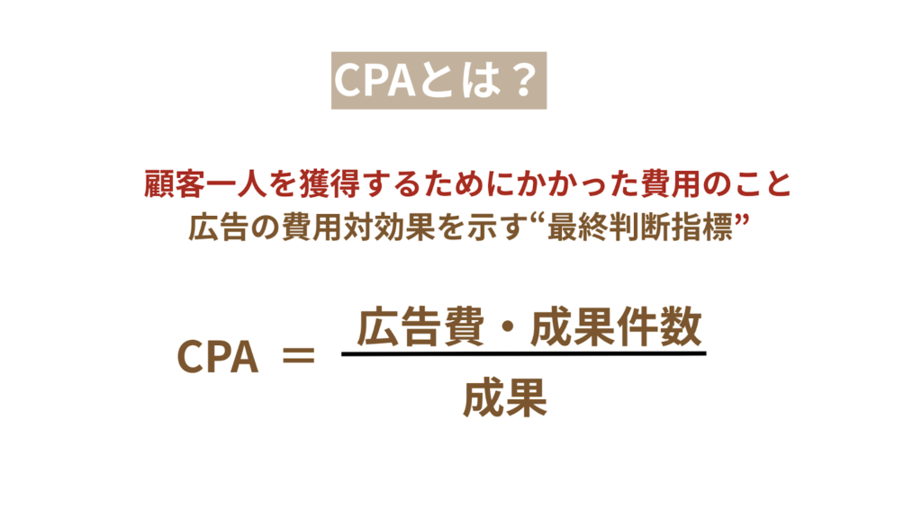 CPAとは、1件のコンバージョン(購入や問い合わせなど)を獲得するのにかかった広告費のことです。