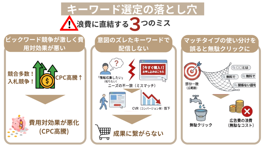 キーワード選定はリスティング広告の根幹を成す工程ですが、成果が出ない原因の多くがこの段階のミスにあります。