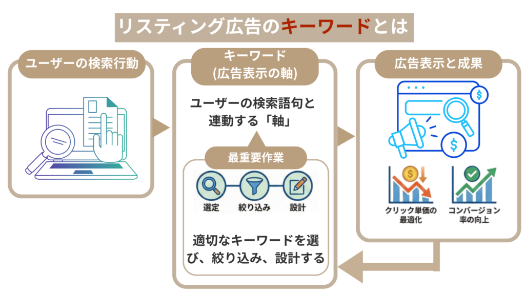 リスティング広告における「キーワード」とは、ユーザーが検索エンジンに入力する語句に連動して広告が表示される仕組みの“軸”となる要素です。